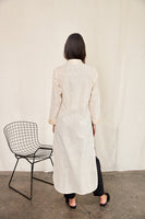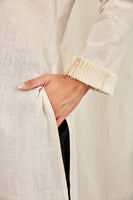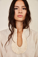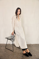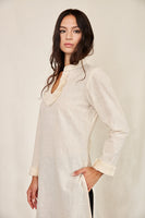 Long Vietnamese inspired cut with graduated accordeon pleats in silk/cotton voile around the oval neckline. In shimmering cotton. The very high side slits and the long length evokes a spirit of subtle elegance.