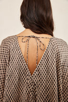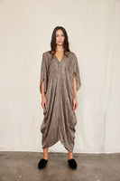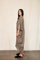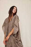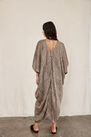 Flowy Kaftan dress with a front slit and back tie. Handcrafted Ajrakh print in oliive black and sand.