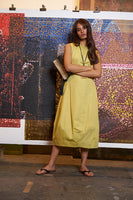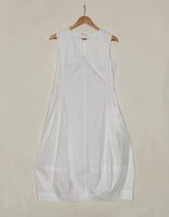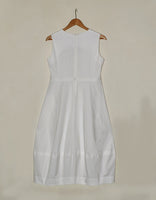Flattering waisted ballon dress with front opening in neckine, side seam pockets and french darts coming up from the waistline.