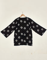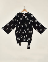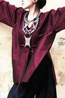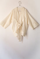 Kimono wrap jacket which has a deceptively simple looking belt to give the versatility to shape the waist or can be worn open. with contrast coloured facing.