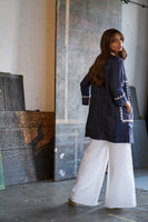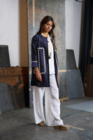 Collarless minimal coat. The refined construction makes this a versatile piece which can be paired for the day as well as evening. the mother of pearl embroidered sequins bring texture to the smooth surface.