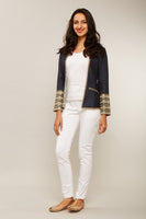 One of the iconic classic White Champa pieces, the Talisay jacket combines the opulence of zari/zardozi embroidery with crisp European tailoring. Available in linen or silk.